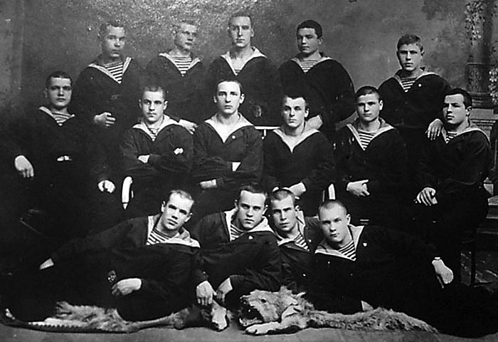Практика курсантов ВВМУ им. М.В.Фрунзе на крейсере «Аврора». Л.К.Бекренев стоит крайний справа с двумя значками на груди. 1925 год.