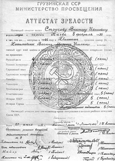 Рассказывает выпускник Нахимовского училища 2007 года, курсант Морского корпуса Петра Великого Струков Григорий Игоревич: Мой дядя, Струков Виктор Иванович, родился 8 февраля 1930 года в городе Киеве в семье военного, Струкова Ивана Ивановича. Учиться в школе начал в г. Ленинграде, где его отец учился в академии. Затем отца перевели на Черноморский флот, затем на Балтику в штаб ПВО флота, и вся семья переехала в г.Таллинн. В 1941 году при переходе кораблей из Таллинна в Ленинград И.И.Струков погиб. Семья эвакуировалась в Куйбышевскую область. В конце 1943 года мой дядя, по документам присланным из Москвы, поехал в Тбилиси, и был принят в Нахимовское училище в числе первых воспитанников. После окончания училища был зачислен курсантом Ленинградского Высшего Военно-морского Инженерно-Технического училища, после окончания которого один год учился в ВМА им. А.Н. Крылова. В 1954 г. был назначен на ТОФ на Амурскую флотилию старшим инженером на СБР. В 1963 году переведен на Краснознаменный Балтийский флот. Последнее место службы - штаб КБФ. В 1978 году по болезни был уволен, после этого долгое время работал в НИИ Морского Флота в городе Ростове-на-Дону. Воинское звание - капитан первого ранга. В 2001 году он умер, похоронен в Санкт-Петербурге на Волковом кладбище.