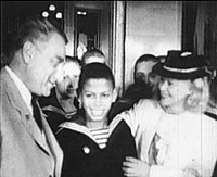 Так вот, в перерывах между съёмками этого кинофильма командованию училища удалось организовать встречу с великой актрисой. Для нас, нахимовцев, и всех сотрудников училища это был большой праздник. Но особенно радовалась сама Л.П.Орлова, когда увидела Джима, рослого красивого, тёмнокожего юношу. Было интересно наблюдать, как легко и свободно держит себя известнейшая и любимая советским народом звезда киноэкрана. Ну а Джима она никуда от себя не отпускала и, переговариваясь с ним, удивлённо показывала всем, как он вымахал, что почти сравнялся с ней ростом. Для истории сохранились кадры кинохроники этого уникального события.