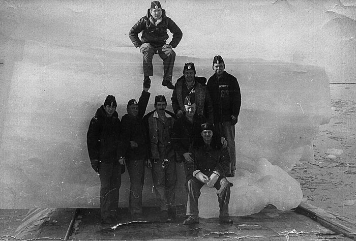 Офицеры РПКСН К-92 после всплытия в Арктике путём взламывания льда и последующей частичной очистки ракетной палубы в августе 1982 г. Справа на льдине сидит командир крейсера В.В. Патрушев, в центре группы стоит начальник штаба 31 дивизии подводных лодок А.А.Петелин.