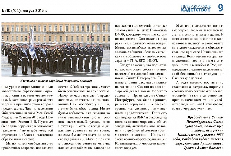 Уважаемая Елена Александровна! Буду рад, если редакция сочтёт возможным опубликовать моё письмо в Вашем издании. Готов дать необходимые комментарии. С уважением, Председатель «Санкт-Петербургского Союза суворовцев, нахимовцев и кадет», выпускник Нахимовского училища 1986 года, кандидат педагогических наук, капитан 1 ранга запаса Грязнов Антон Олегович « 12 » августа 2015 года