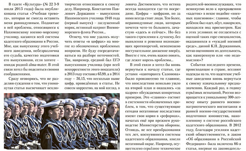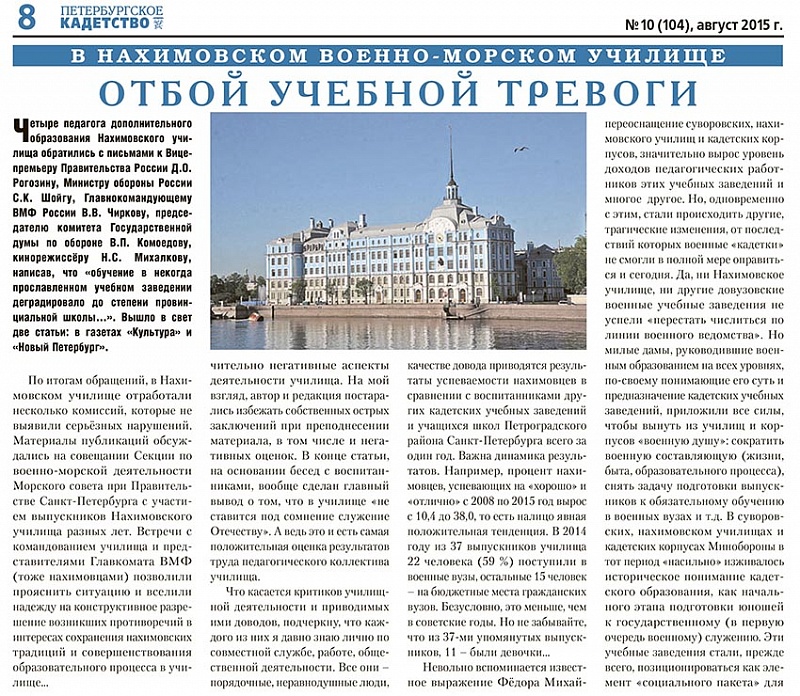 В газете «Культура» (№ 22 3-9 июля 2015 года) была опубликована статья «Учебная тревога», которая не смогла оставить меня равнодушным. Поднятые в ней проблемы, относящиеся к Нахимовскому военно-морскому училищу, касаются всей системы кадетского образования в России. Мне, как выпускнику этого учебного заведения, небезразлична его судьба, качество подготовки его выпускников, если хотите – имидж родной alma-mater. В этой связи хотел бы поделиться своими соображениями.