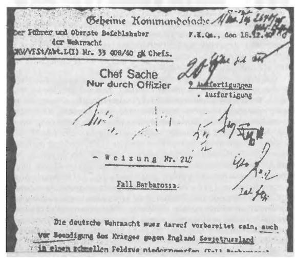«Долгое время считалось, что СССР не располагал текстом Директивы № 21- «План Барбаросса», причем указывалась на то, что им располагала американская разведка, но не поделилась с Москвой. Американская разведка имела действительно информацию, в том чucлe и копию Директивы № 21 «План Барбаросса».